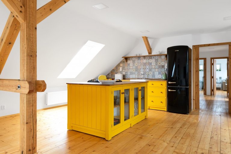 Dominantou kuchyně je krásný kuchyňský ostrůvek, v přední části s elegantními skleněnými dvířky. Na vnitřní straně kuchyňského ostrůvku je zabudovaná plynová varná deska a elektrická trouba značky SMEG. Černá barva spotřebičů vytváří úžasný kontrast s šafránově žlutou barvou. Všechny naše kuchyně precizně ručně natíráme. Úchytky dovezené z Velké Británie krásně ladí k pracovní desce a polici z masivního dubu. Dalším výrazným prvkem kuchyně je prostorný keramický belfast dřez anglické značky Shaws of Darwen, který je doplněn tradiční mosaznou baterií. Na přání klienta jsme vyrobili dubovou bedýnku na pojezdech pro uskladnění zeleniny.