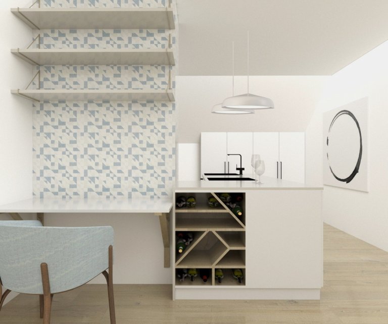 V malém pražském bytě bylo nutné zařídit zcela novou kuchyni na kterou ale zbývalo jen velmi málo místa, majitelé si však přáli do kuchyně umístit také pračku se sušičkou a vinotéku. Půdorys je navíc nešťastně rozdělen instalační šachtou. Celé řešení tedy muselo být zejména praktické. Rozhodli jsme se pro ostrůvkovou kuchyni ve světlých šedobéžových barvách v kombinaci se světle modrým geometrickým obkladem. Jednoduchou barevnost jsme doplnili černými spotřebiči a detaily v podobě kuchyňské baterie a úchytek. Skromné úložné prostory jsme rozšířili pomocí skříněk které jsme umístili do chodby. Návrh vznikl ve spolupráci s Truhlářstvím Ochozka.