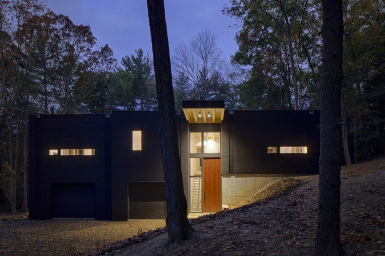 Dům je zasazen do údolí, přesněji řečeno přímo do svahu, a tak jeho vzhled tolik nenarušuje tón krajiny. A to nejen díky umístěni, ale také díky vnějšímu vzhledu, ve kterém architekti uplatnili své znalosti z japonské techniky úpravy dřeva sugi ban = zuhelnatění dřeva. Díky této technice působí cedrové dřevo originálně a luxusně. Na kráse domu neubírají ani žlaby, které jsou v tomto případě vložené a neruší tak velmi elegantní vzhled. Obdélníkový tvar domu, který je částečně zakomponován do kopcovité krajiny, vystupuje z nižší, ale velkoryse řešené garáže, a vytváří tak otevřený prostor ideální pro zábavu, relaxaci u ohně nebo přípravu domácího jídla.