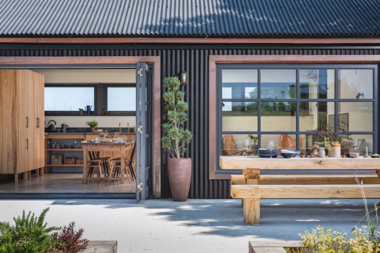 Po šikmé střeše steče všechna voda. Ubrání se větru, dešti i krupobití. Je z černého vlnitého plechu, který si architekt natolik oblíbil, že jej použil také na obklad domu a kuchyni na terase. Dramatický ráz a poněkud strohý dojem černého plechu zjemňuje hřejivý dotek masivního dřeva. To se objevuje jak v exteriéru, tak v interiéru.