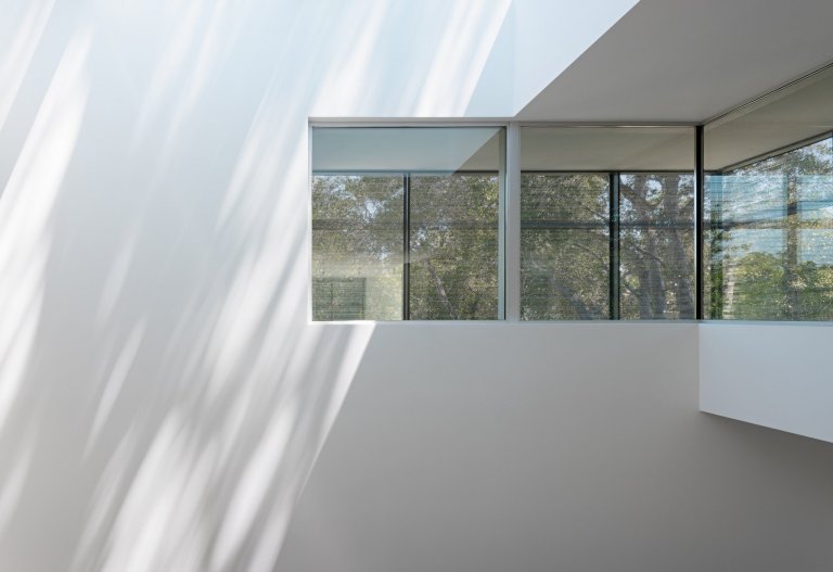 Členění interiéru je řešeno poněkud atypicky. Zatímco ložnice směřují do ulice, obývací pokoj a kuchyně se nacházejí v zadní části domu. Společenské prostory se tak otevírají přímo do zahrady. Interiér sjednocuje umění, které o sobě dává vědět v každé místnosti. Kontinuitu zajišťuje také šedá vápencová podlaha propojující vnitřek domu s venkovní terasou. Hlavní roli v interiéru hraje bílá barva, která představuje ideální pozadí pro vystavení děl této soukromé galerie. Ve sužbách umění ustupují také detaily, které jsou v celém objektu naprosto minimální.