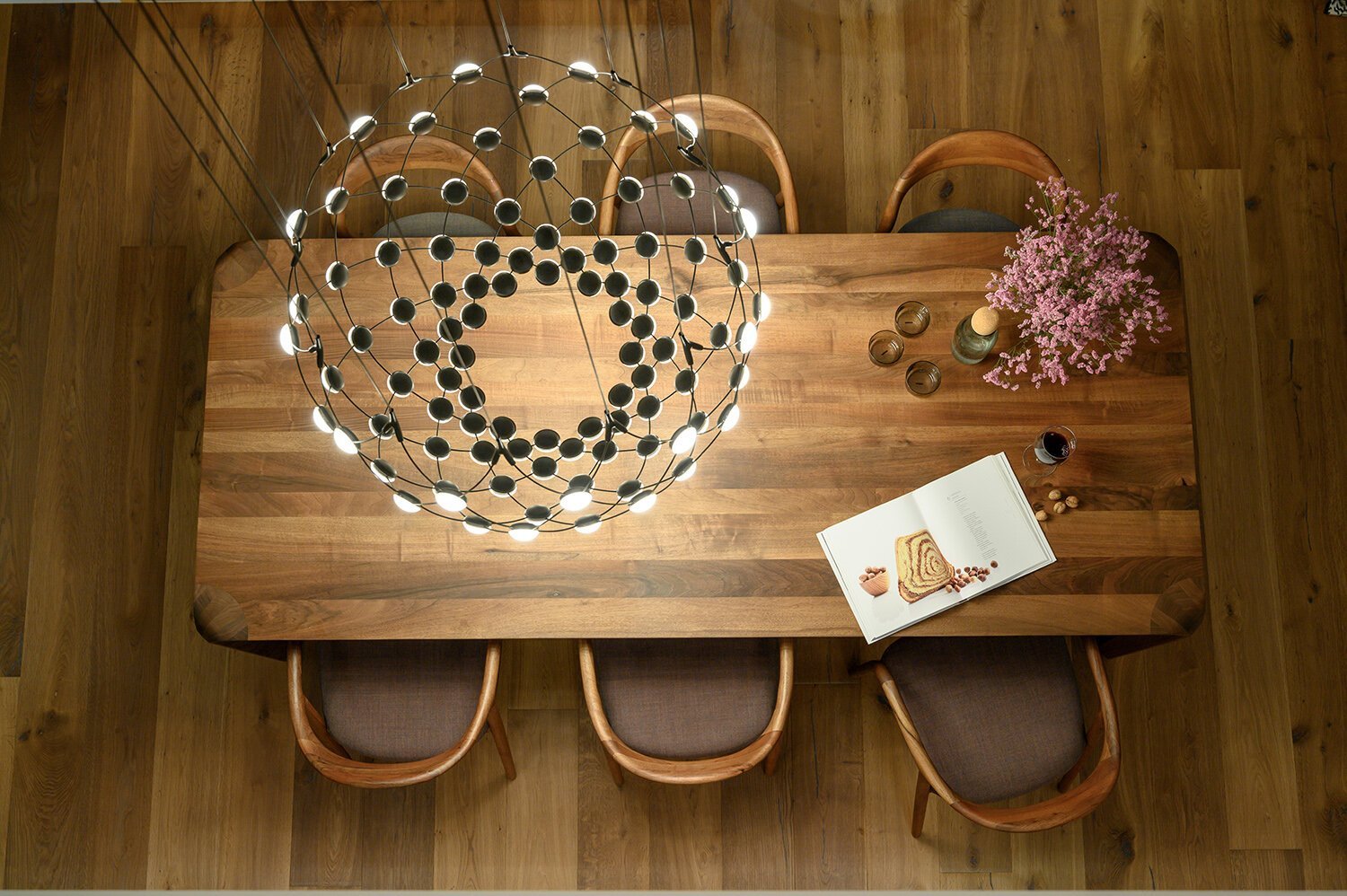 O osobitý vzhled bydlení se postaraly designérky Tina Rugelj a Maja Laurence. Pohrály si s prostorem, světlem, barvami a materiály, a vytvořily tak vcelku nevšední interiér. Ponechaly mu velkou otevřenost a vzdušnost. Hlavní roli pak svěřily dřevu, které se zde nachází v různých proměnách.