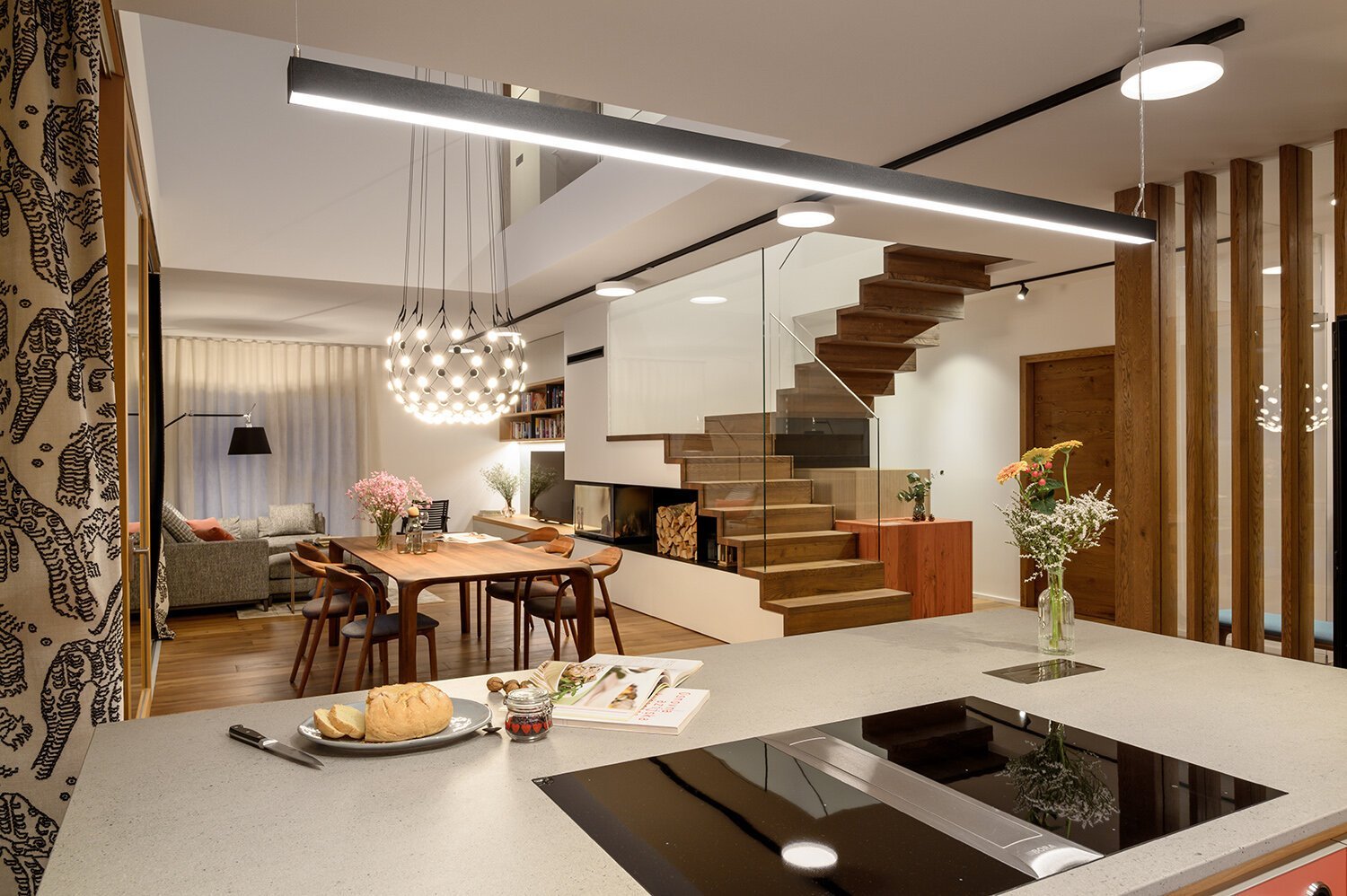 Interiér s exteriérem propojují velké prosklené plochy. Jejich prostřednictvím směřuje dovnitř domu velké množství denního světla. V případě příznivého počasí lze oba prostory propojit a užívat si slunečních paprsků. Právě velkoryse pojatý obývací pokoj propojený s kuchyní a jídelnou je srdcem tohoto bydlení. Dominuje mu velký dřevěný stůl obklopený židlemi ze stejného materiálu. Ještě více jeho přirozenou krásu umocňuje dřevěná podlaha. Nad jídelní stůl se snáší designový lustr, který tomuto prostoru dodává elegantní ráz. Ve stejném minimalistickém duchu je řešen i obývací pokoj, jemuž vévodí velká sedací souprava. Také tuto zónu prosvětlují velká okna, která lze v případě potřeby zastínit elegantními závěsy. Dřevo je dominantním prvkem i v dalších místnostech domu a dává o sobě vědět mimo jiné v případě zajímavě řešeného schodiště, které doplňují úložné prostory ze stejného materiálu.
