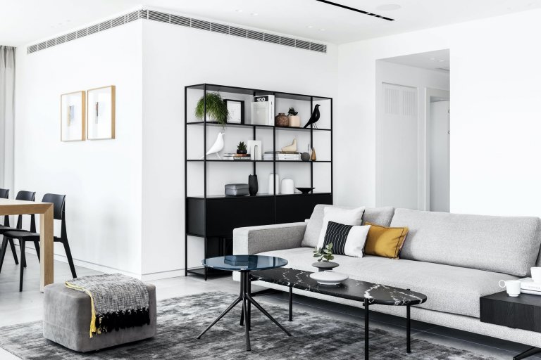 Kombinace černé a bílé barvy patří mezi charakteristické znaky tolik populárního minimalistického stylu. Elegance a jednoduchost těchto barev totiž dokáže podtrhnout čisté struktury nábytku a dekorativních prvků. A jinak tomu není ani v tomto izraelském apartmánu. Představuje barevnou paletu odstínů, které se pohybují od bílé přes šedou až k černé. Obzvláště kontrastní barvy si užívají velká okna přinášející do interiéru dostatek denního světla. Z ostře bílé zdi na pozadí vystupují černé rámy oken, a tak strhávají pozornost obyvatel domu a jejich hostů na úchvatný výhled do parku. Monochromaticky laděný interiér příjemně rozbíjejí osobité tyrkysové a bronzové akcenty. Zatímco klasická kombinace černé a bílé barvy tak vnáší do interiéru nádech severské atmosféry, tolik potřebný v horkých měsících, svěží barvy dodávají tomuto bydlení tu správnou energii.