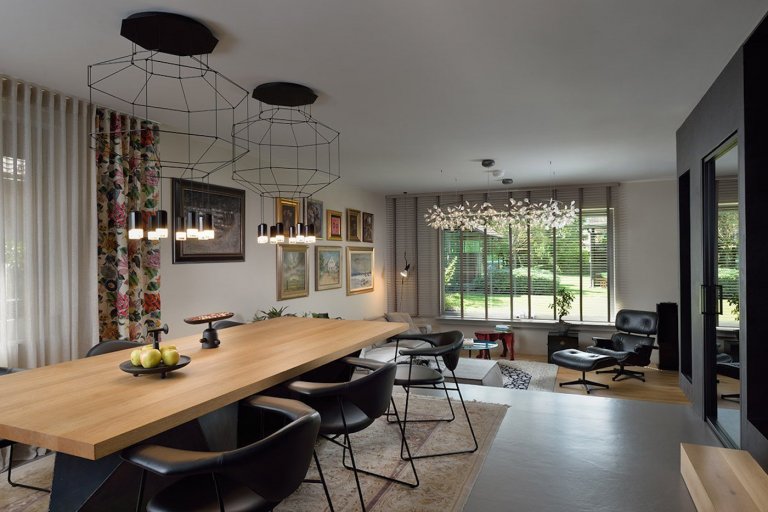 Začněme od začátku: nový stůl s masivní dřevěnou deskou na impozantní kovové základně byla láska na první pohled. Architekti stůl skvěle doplnili dvojicí lustrů a kovovými židlemi s koženým sedákem. Celá tato kompozice byla umístěna na perský koberec - rodinné dědictví. A tak původní jídelna zcela změnila svůj ráz a již přestala odpovídat zastaralému interiéru. Touha po větším a příjemnějším jídelním stole vyvolala skutečný dominový efekt. Architektka Tanja Span Vasiljevic z Archimetrics Bureau říká: „Dům byl postaven v roce 1986. Bez stavebních prací jsme chtěli co nejlépe využít prostor a vytvořit interiér, který je pohodlný, užitečný a kvalitní. Neformální luxus plný teplých a mírně tmavých tónů a neobvyklých vybraných kusů nábytku odráží rozhodující charakter klienta.“