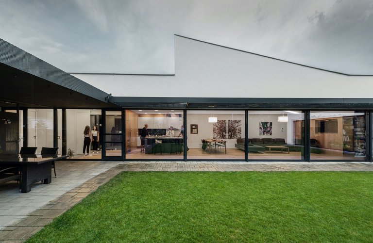 Půdorys hlavní obytné části, který doplňuje do tvaru písmene C blok dětských pokojů a přístřešek parkovacích stání, vymezuje privátní prostor zahrady. "Dvůr s udržovaným trávníkem lze přirovnat k rajské zahradě středověkých klášterů. Zvolená forma má několik skrytých významů. Mezi ně patří i tvar půdorysu, který objímá zahradu a je symbolem pečlivé rodiny," vysvětlují architekti ateliéru at26.