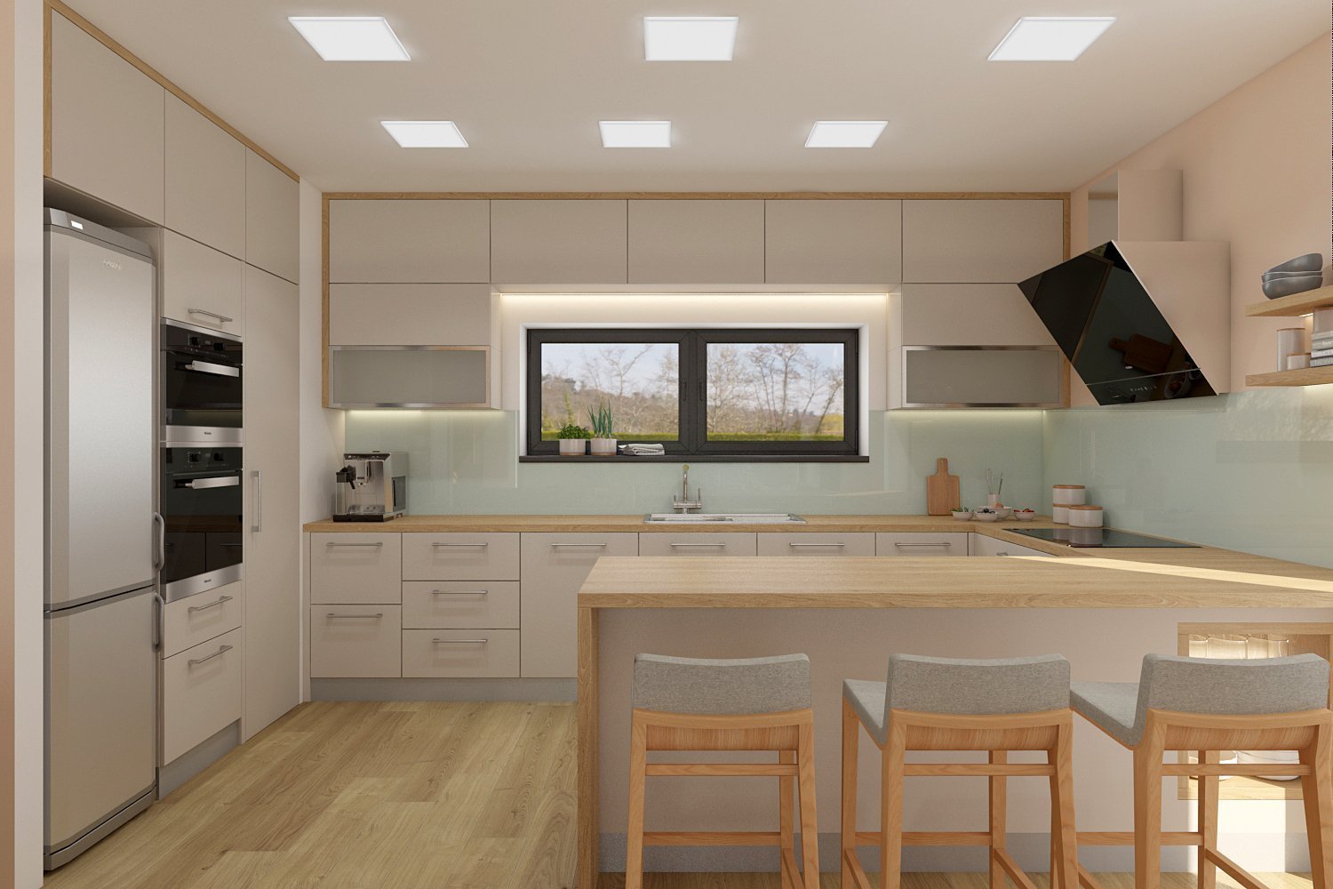 Kuchyňský nábytek jsme uspořádali tak, aby alespoň jedna z jeho pracovních ploch byla obrácena směrem do místnosti. Zvolili jsme prodloužení kuchyňské linky v podobě barového pultu, díky kterému, ať už budete připravovat např. salát nebo jenom otvírat láhev vína, vždy můžete stát čelem k obývacímu pokoji a tím být v kontaktu s ostatními členy rodiny či hosty. K barovému pultu jsme umístili praktické barové židle. Dále následuje jídelní stůl s židlemi a navazující obývací část.