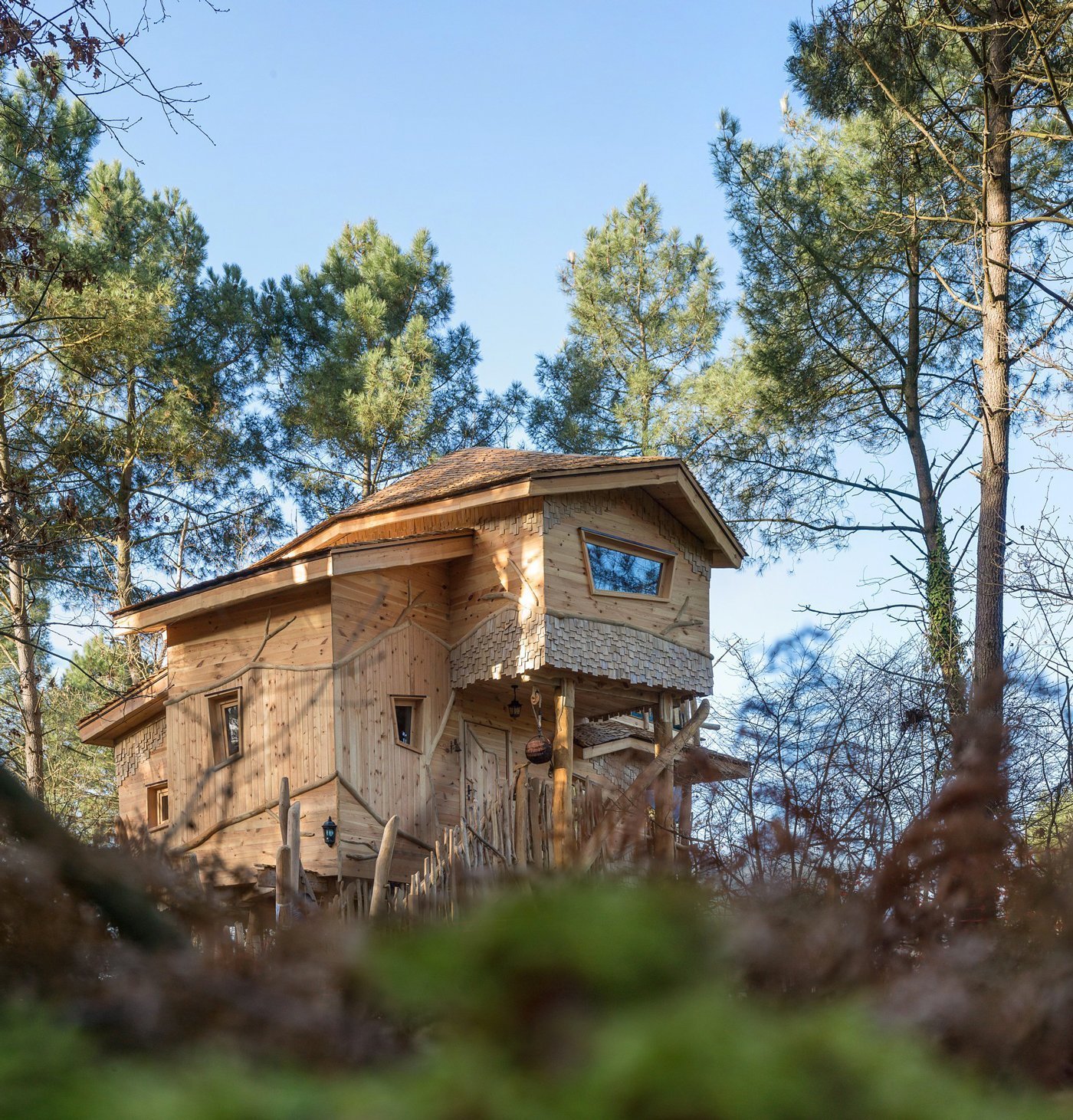 se rozhodli vybudovat ve francouzském národním parku Le Bois aux Daims ležícím 100 km východně od přímořského města Nantes. Dům stojí na několika stromech a dřevěných pilotech, nahoru nemusíte šplhat po laně, ale dostanete se tam po pohodlném schodišti. Dřevo je dominantní materiál a prostupuje také celým interiérem. Ve dvou ložnicích může být ubytovaná i početnější rodina. Stylově vybavený obývací pokoj vybízí k odpočinku na pohodlných pohovkách. Jestli nechcete opustit výdobytky techniky ani v korunách stromů, nemusíte. Ve vybavení nechybí televize, myčka, mikrovlnka a dokonce ani vířivka. Přesto se ale domnívám, že uvnitř domku dlouho nevydržíte. Pohodlně zařízené terasy s překrásným výhledem do národního parku jsou totiž tím nejlepším kompromisem. Zde můžete trávit čas uprostřed divočiny s šálkem teplé kávy v ruce a papučemi na nohách.