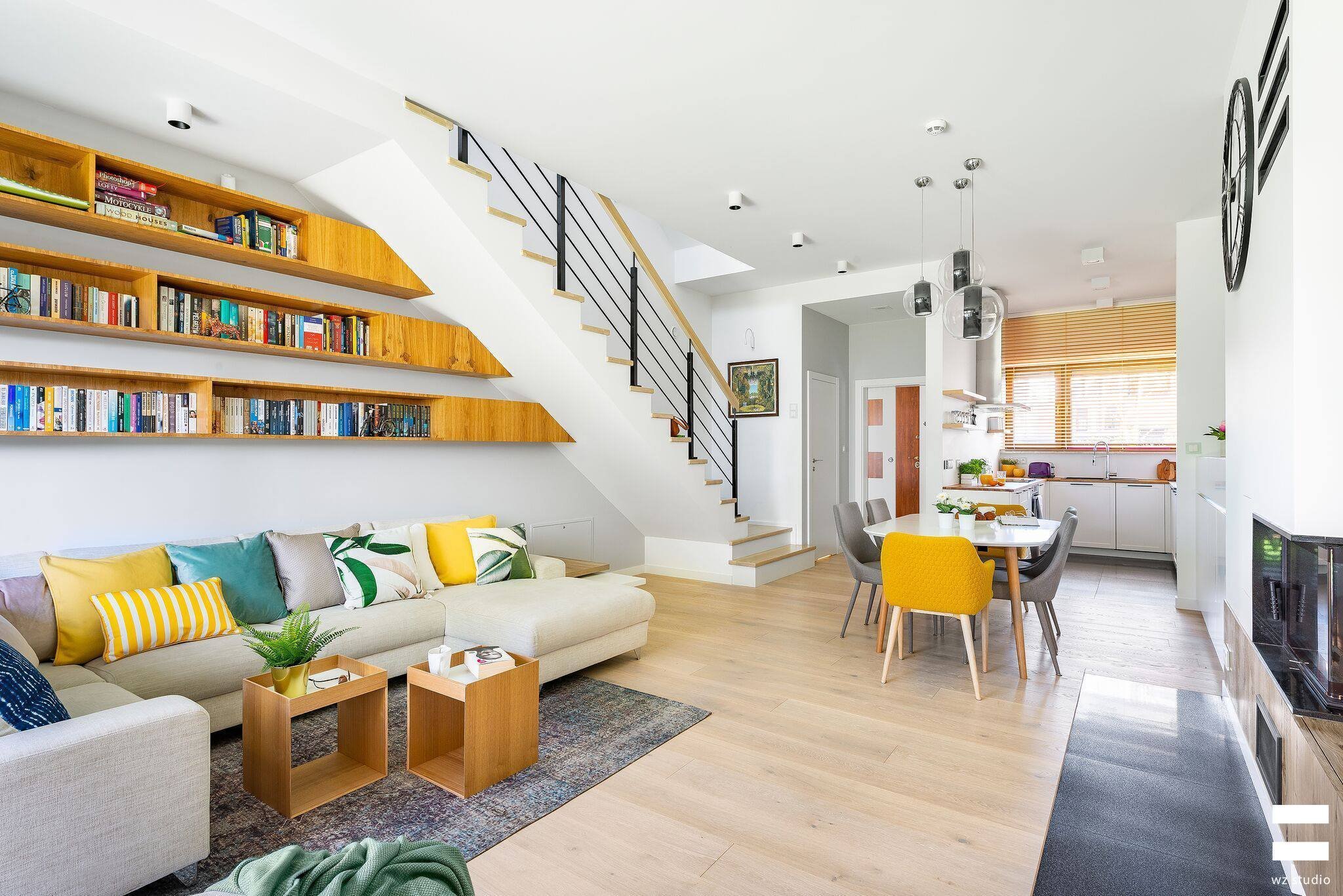 Za interiérem polského domu stojí architekti ze společnosti WZ Studio, kterým se podařilo vytvořit prostor plný světla, barev i zajímavých designových prvků. Světlo sem prostupuje dostatečně velkými okny, která v případě potřeby stíní žaluzie barevně korespondující s odstíny dřeva, jež je v interiéru hojně zastoupeno. To si libuje ve své přirozenosti a na první pohled zaujme překrásnou texturou. Hřejivý dojem z interiéru umocňují doplňky v jasně žluté, zelené nebo modré barvě, které celému bydlení dodávají na svěžesti a dynamice. Prostor zde dostává i bílá, šedá a černá barva. Ty jsou využity s citem, a tak nenarušují živelnou barevnost celku, jen ji místy příjemně zklidňují.