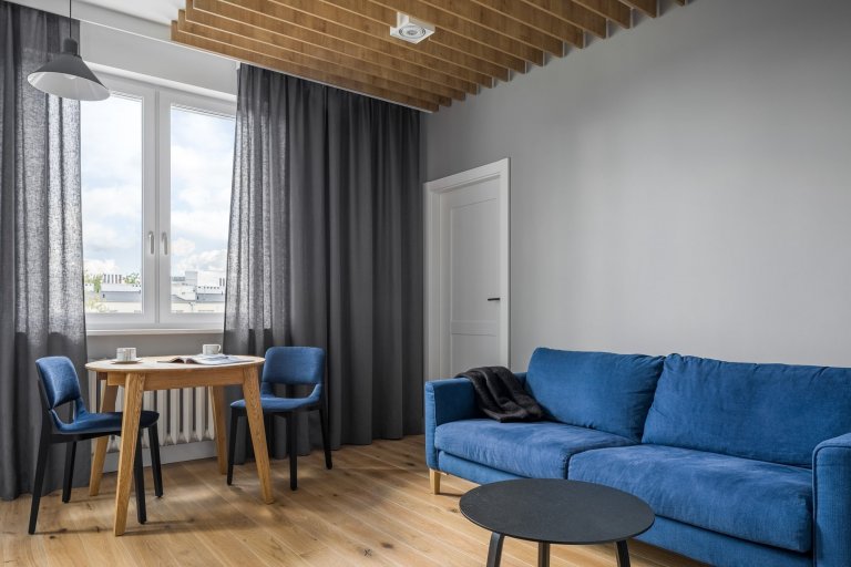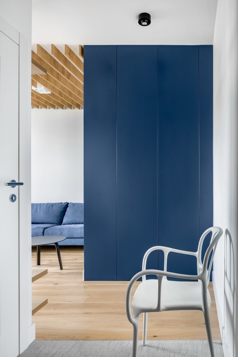 Ačkoliv se jedná o pánský interiér, nuda v něm místo nemá. Zajímavé tvary, materiály a barvy dodávají bytu na eleganci, která je skromná a nevtíravá. Duch minimalismu jistě přiláká celou řadu návštěvníků, a nemusí přitom jít výhradně o muže. Sametový nádech modré barvy, závěsy splývající až na zem, velká okna, čisté linie, stylová svítidla, … To všechno představuje osobnost majitele ve své instantní kráse. Jednoduchost tohoto varšavského bytu je tedy naopak nápaditá a svá. Nenudí, ale zaujme. Největší roli tu však stejně odehrají tolik příjemné odstíny sametově modré barvy.