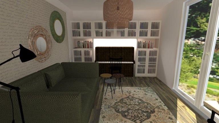 celému prostoru dominuje pohodlná rozkládací sedačka spolu s tapetou v přírodních tónech. tapeta má motiv latinských textů, které nádherně vyniknou díky umístění ve středu stěny a orámování lištami. zelená je všeobecně vnímána jako barva uklidňující, zde navíc propojuje interiér s prostorem venkovním. taktéž má blahodárný vliv na oči unavené od čtení.