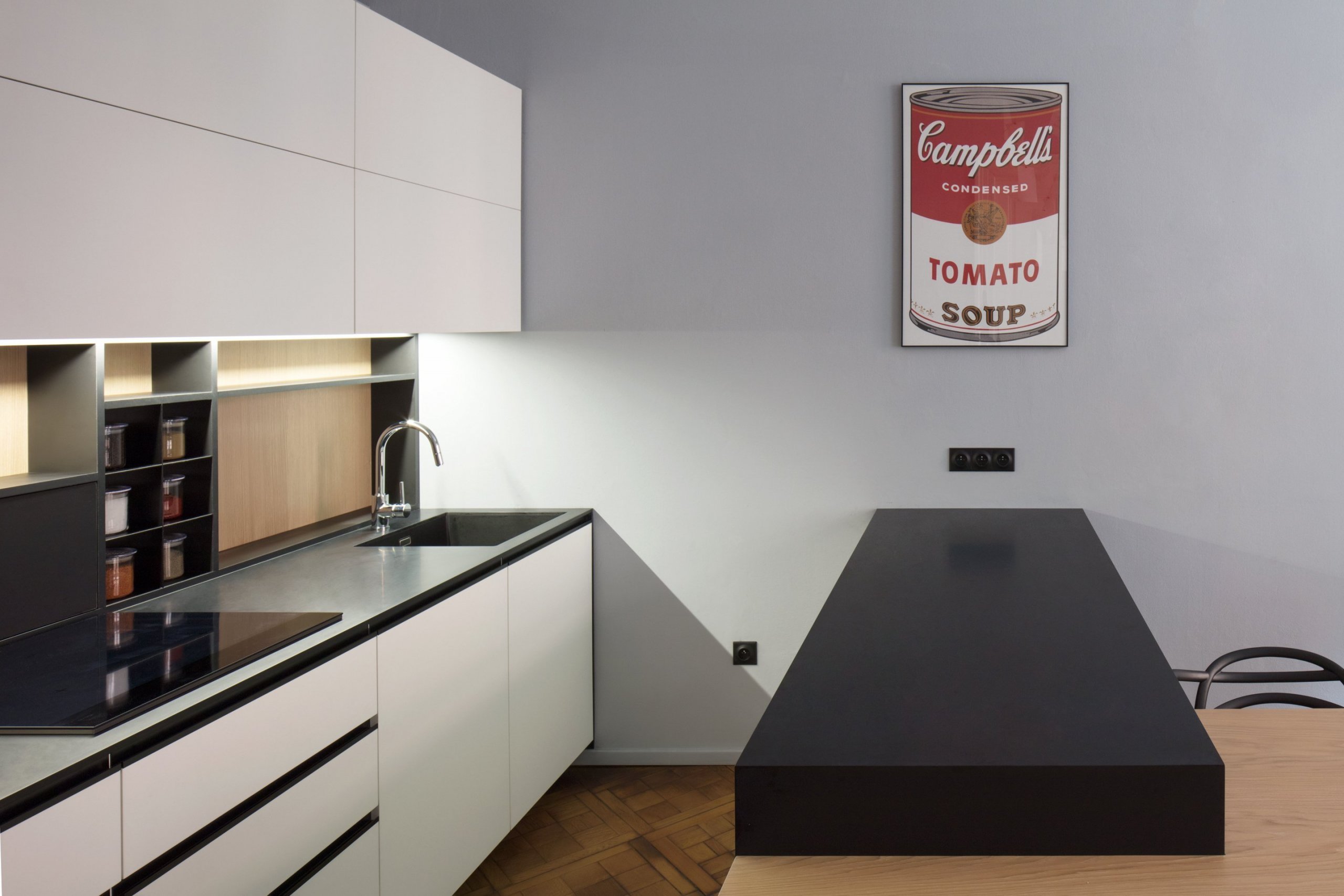 Moderní kuchyně citlivě korespondující s bytem v historickém domě v Královských Vinohradech. Použity byly materiály jako: černý Corian, bělená dubová dýha. Dominantou je lustr od Ingo Maurer, interiér vhodně doplńují židle Kartell Masters.