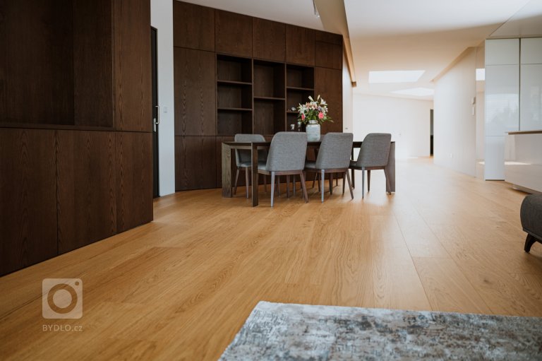 Překrásný moderní interiér v minimalistické kombinaci bílé barvy a dřeva. Tak by se dal popsat prostor, ve kterém najdete naši dubovou podlahu v provedení Select - PURE matná.