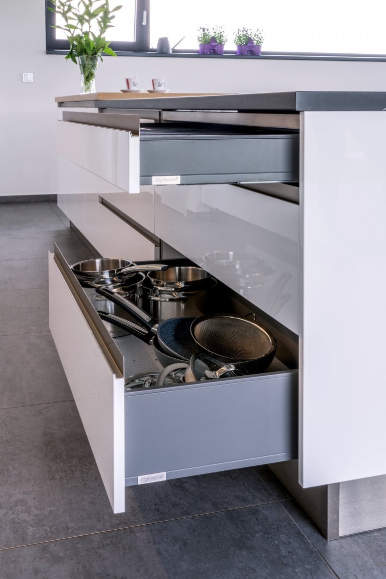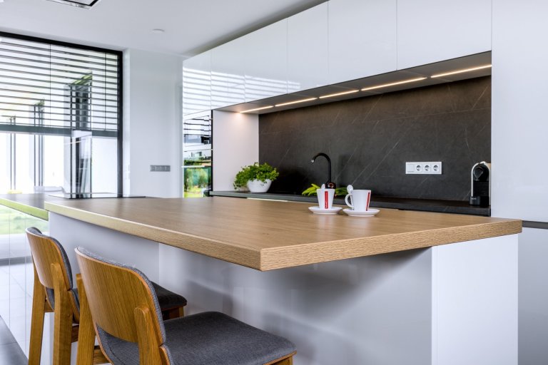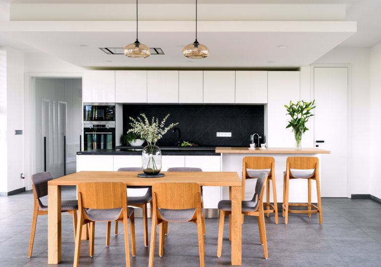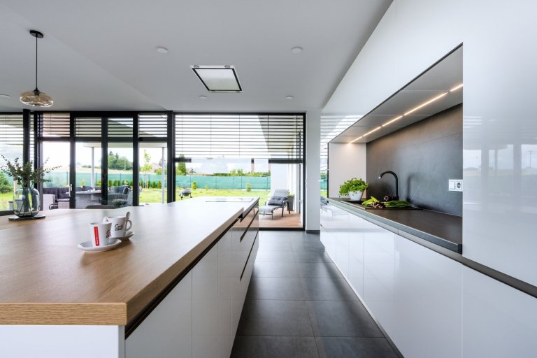 Legendární kombinace? Nadčasová elegance? Ikonický design? Spojení bílé s černou má spoustu zavedených pojmenování a všechny do jednoho jsou přiléhavá. I v tomto případě vytváří mix světlých ploch s tmavými prvky až mysticky svěží atmosféru, ve které se dynamicky střídají nejen barvy, ale i pocity - od prvotního úžasu přes nadšení až po radostné uspokojení z výborné volby. Černobílá kuchyně nikdy nezevšední, stejně jako nezestárne její vizuální přitažlivost. Mladí manželé vsadili ve spolupráci s designérkou Sykora na sestavu v bílém korpusu Top lak lesk White; do kontrastu s tmavým dřezem, tmavým obložením a atypickou černou baterií. Atraktivní vzhled se tu potkává s praktičností. A organizovaný řád s čistou, velkorysou vzdušností. Vše realizované v jedinečném, na míru vytvořeném projektu.